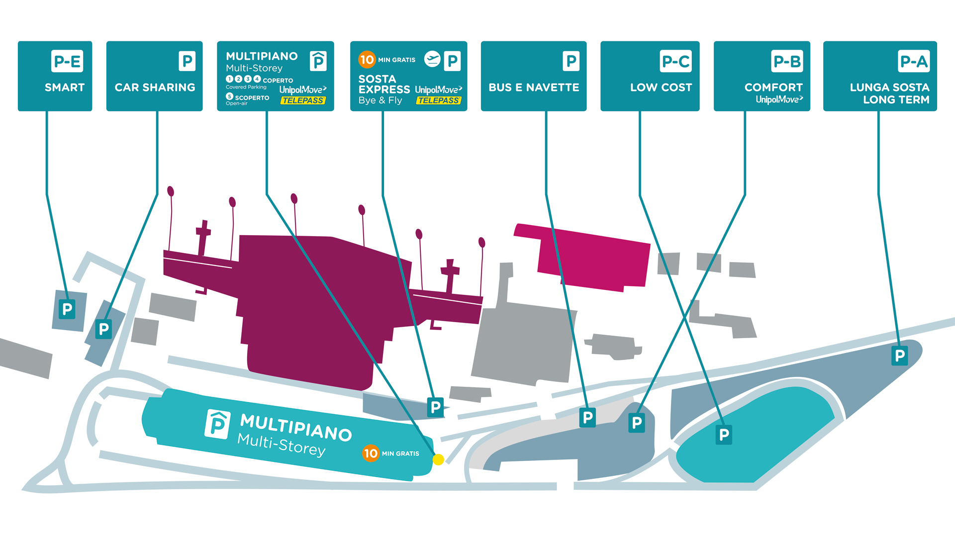 P – E smart si trova a soli 3 min a piedi dal terminal Arrivi e offre un’esperienza di parcheggio facile e rapida, 24 ore su 24!